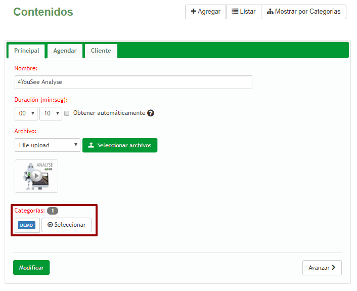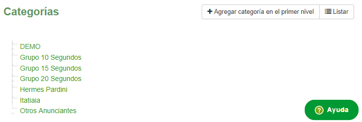 En este ejemplo, las categorías se crearon con el propósito de agrupar los contenidos por su duración. La categoría "Grupo 10 segundos" tendrá contenido con una duración de 10 segundos, la categoría "Grupo 15 segundos" tendrá contenido con una duración de 15 segundos y lo mismo con el tercer grupo "Grupo 20 segundos"