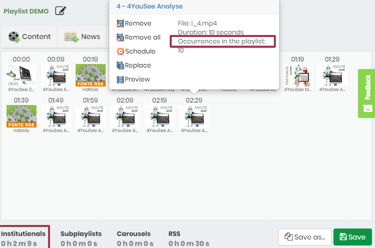 Puede agregar el mismo contenido a la lista de reproducción tantas veces como desee. Observe que el contenido "4YouSee A ..." se agregó 10 veces. En la parte inferior de la pantalla, puede verificar el tiempo total de la lista de reproducción.