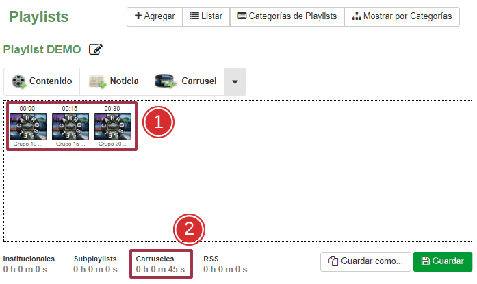 Después de asociar al menos un contenido a cada carrusel, agregaremos los carruseles a la lista de reproducción.