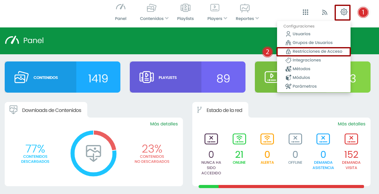 Acceda al menú principal en Configuraciones (1) -> Restricciones de Acceso (2).