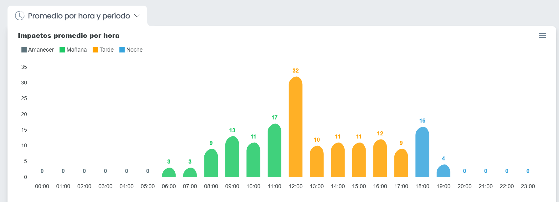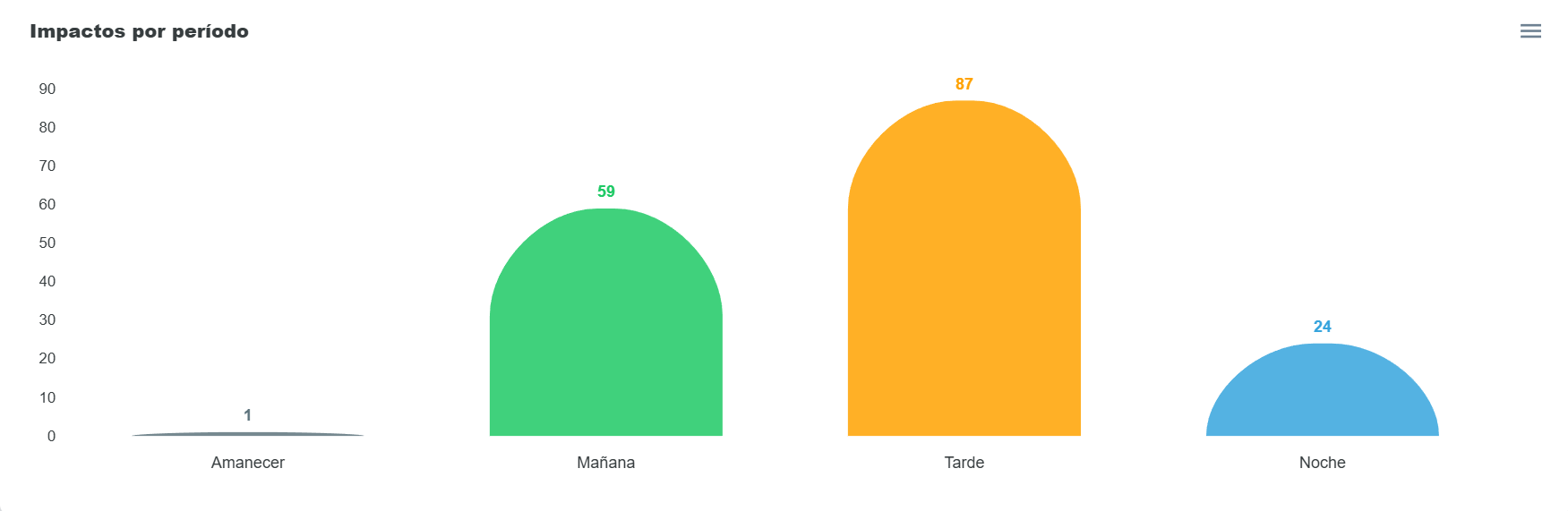 Combina datos de alcance a lo largo de los días con análisis de períodos (mañana, tarde, noche) y el tipo, sea personas o vehículos.