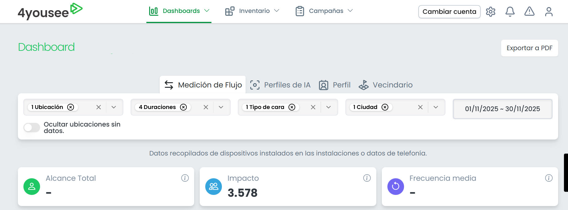 Este panel muestra datos reales sobre cuántas personas fueron impactadas por sus pantallas de digital signage (paneles LED, monitores, tótems digitales). Las informaciones son recolectadas por cámaras con inteligencia artificial instaladas en el ambiente físico donde sus pantallas están localizadas.