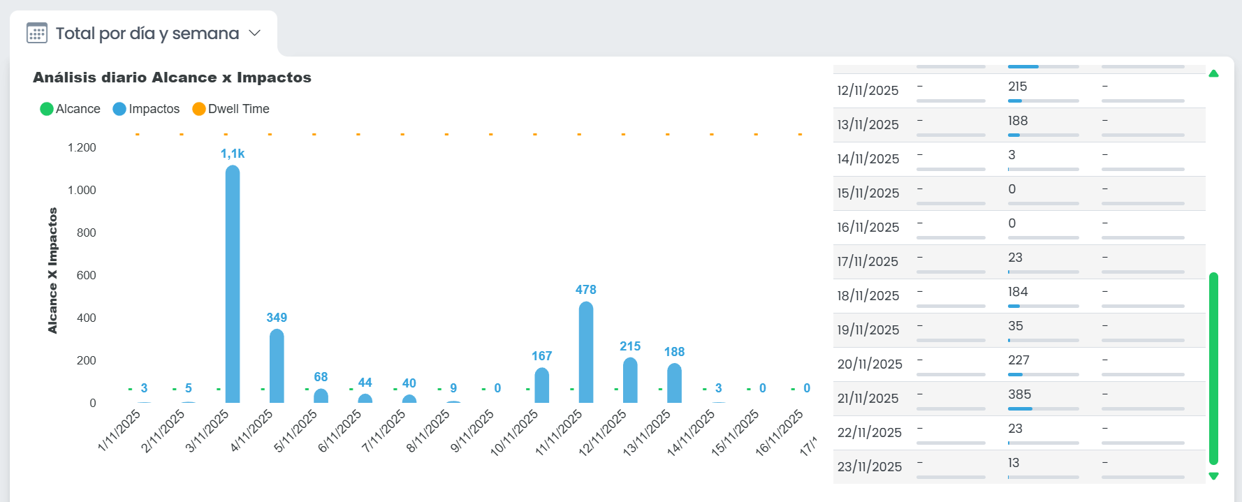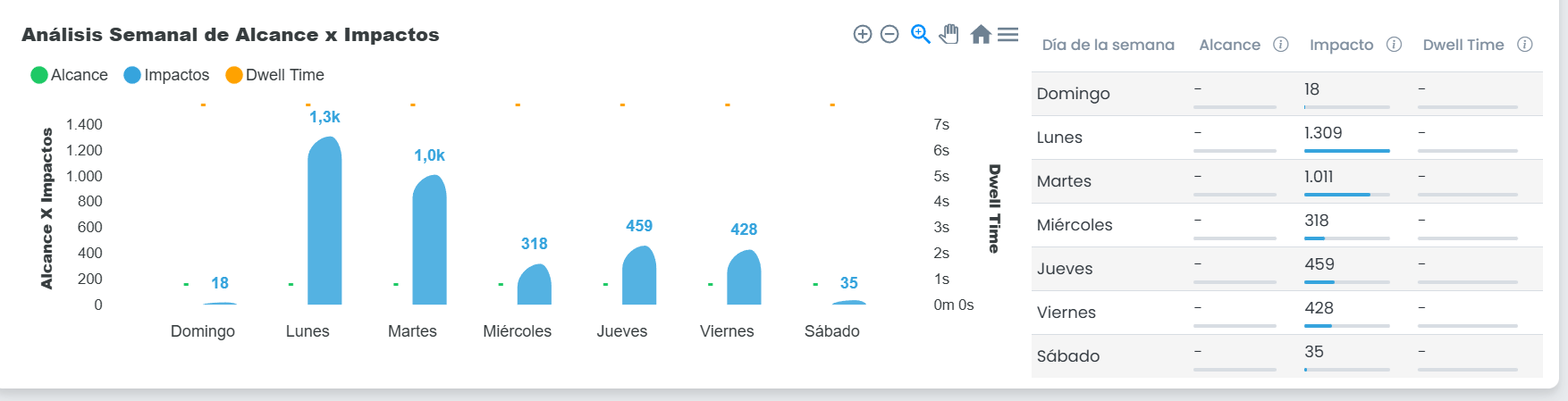 Este gráfico muestra, día por día, cuántas personas pasaron por el lugar (alcance) y cuántas prestaron atención (impactos).