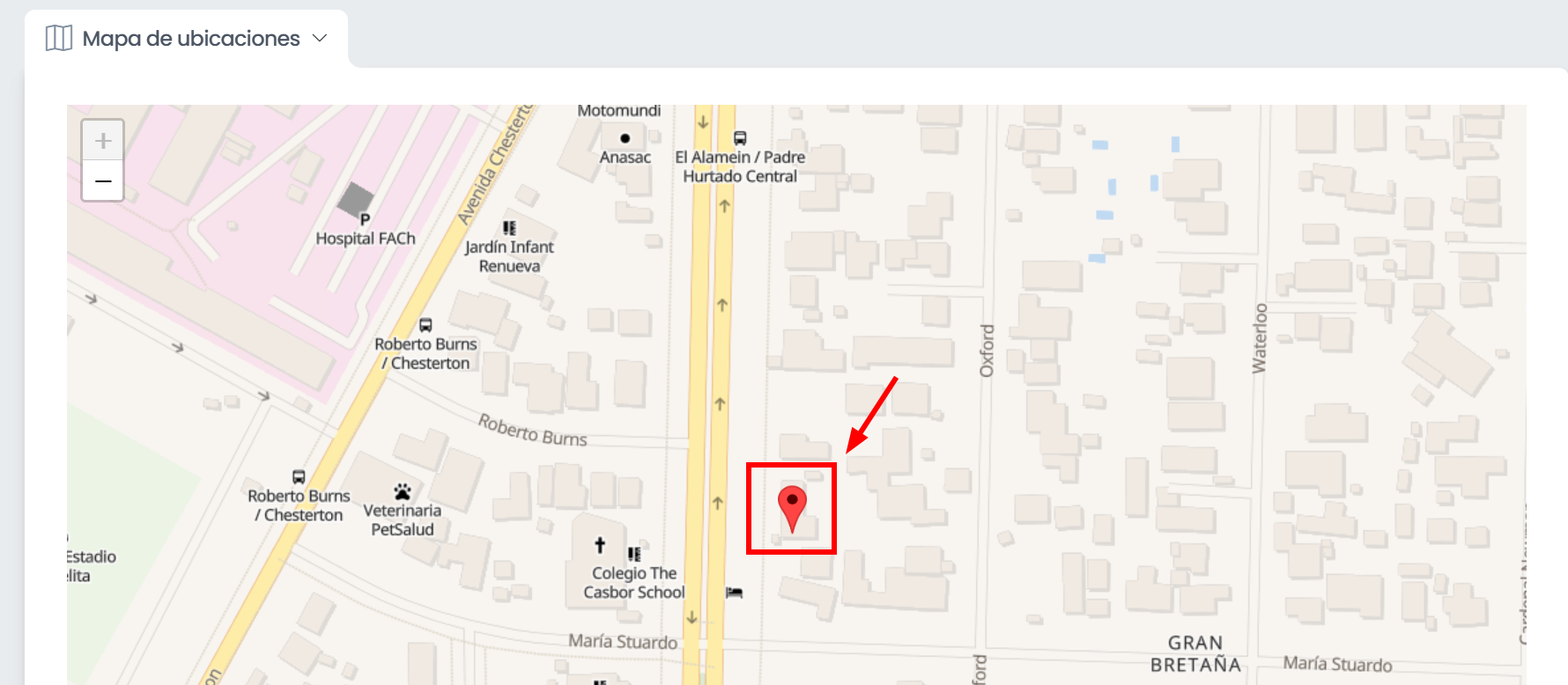 El mapa muestra dónde físicamente están localizadas sus pantallas/cámaras. El marcador rojo indica el punto de instalación.