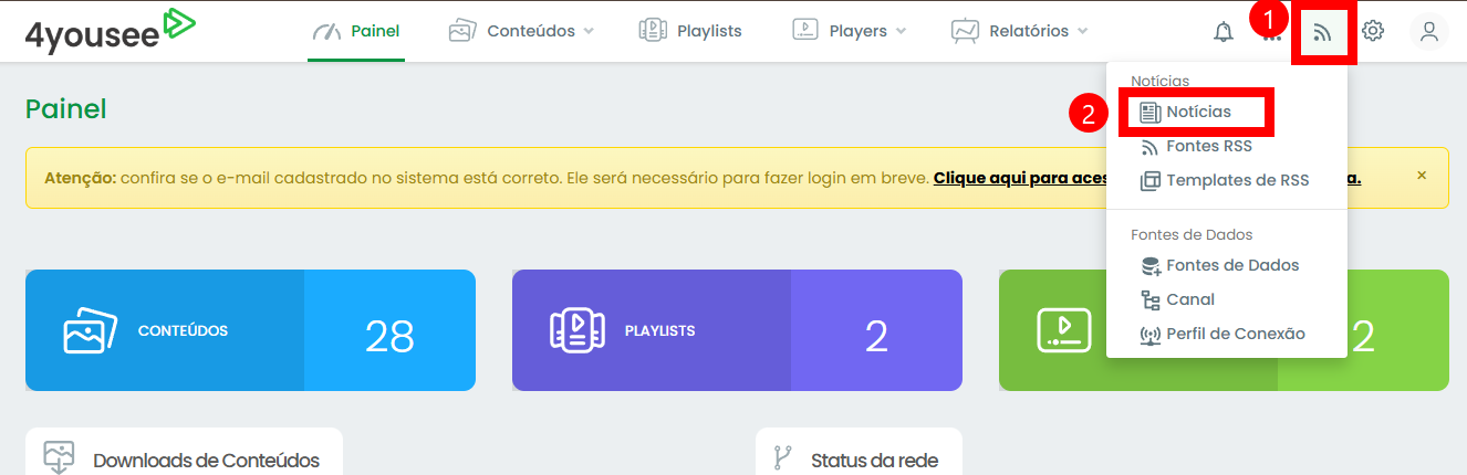 Para visualizar as notícias cadastradas acesse a partir do Feed de Notícias(1) -> Notícias(2). A tela com a lista de notícias cadastradas será mostrada:
