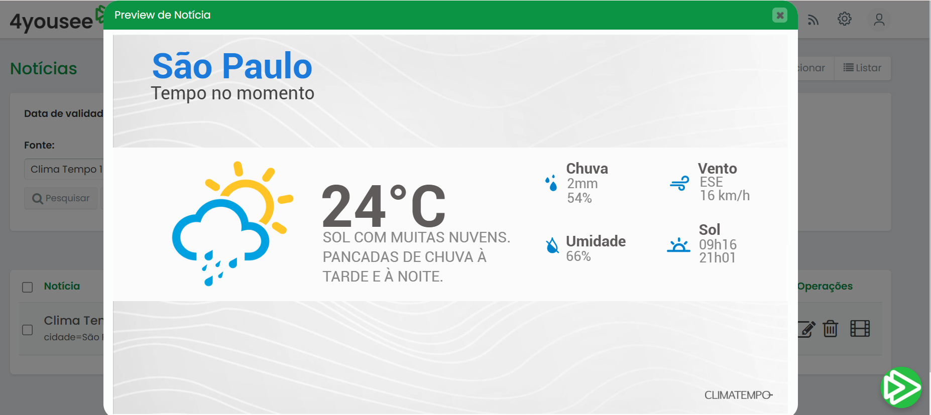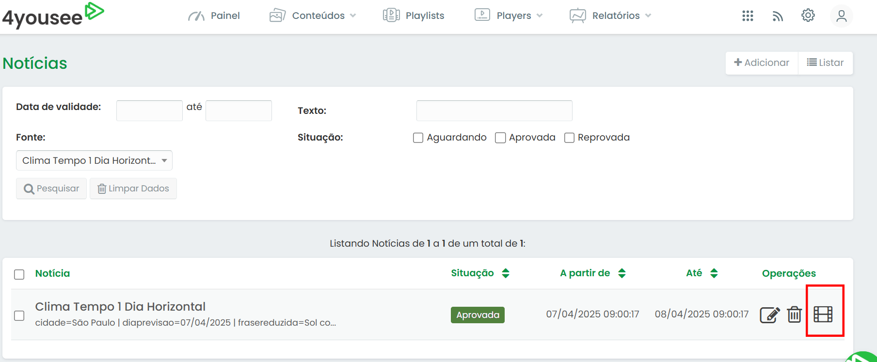 Você pode visualizar a notícia como será exibida no player clicando sobre o botão de Preview.