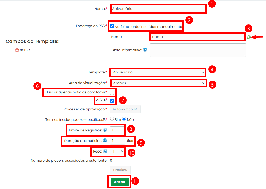 - Duração das notícias é a quantidade de dias que você quer que o template de aniversário seja exibido.